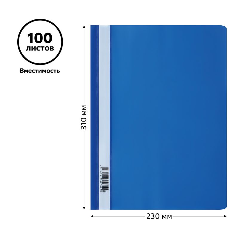 Папка-скоросшиватель предназначена для транспортировки, хранения и систематизации документов. Изделие изготовлено из качественного полипропилена толщиной 160 мкм. Изделие размером 230*310 мм имеет синий цвет с прозрачным верхним листом. Вместимость – до 100 листов. Папка защищает документы от пыли, влаги и прочих повреждений.