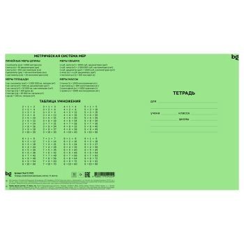 Тетрадь "BG" с зеленой обложкой изготовлена в соответствии с ГОСТ Р 54543-2011. Предназначена для дошкольников и учащихся начальных и средних классов.