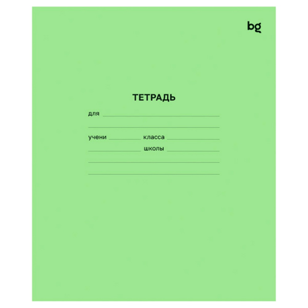 Тетрадь BG с зелёной обложкой. Она предназначена для дошкольников, учащихся начальных и средних классов. Линовка — клетка с полями.