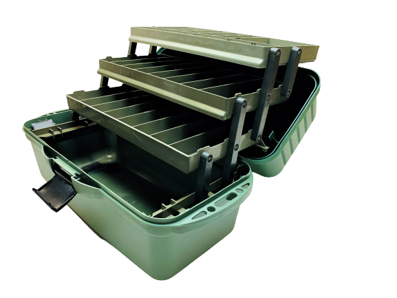 Ящик для хранения снастей. Коробка изготовлена из высокопрочного противоударного пластика. На корпусе коробки для снастей расположена ручка для переноски, крышки фиксируются удобными защелками.