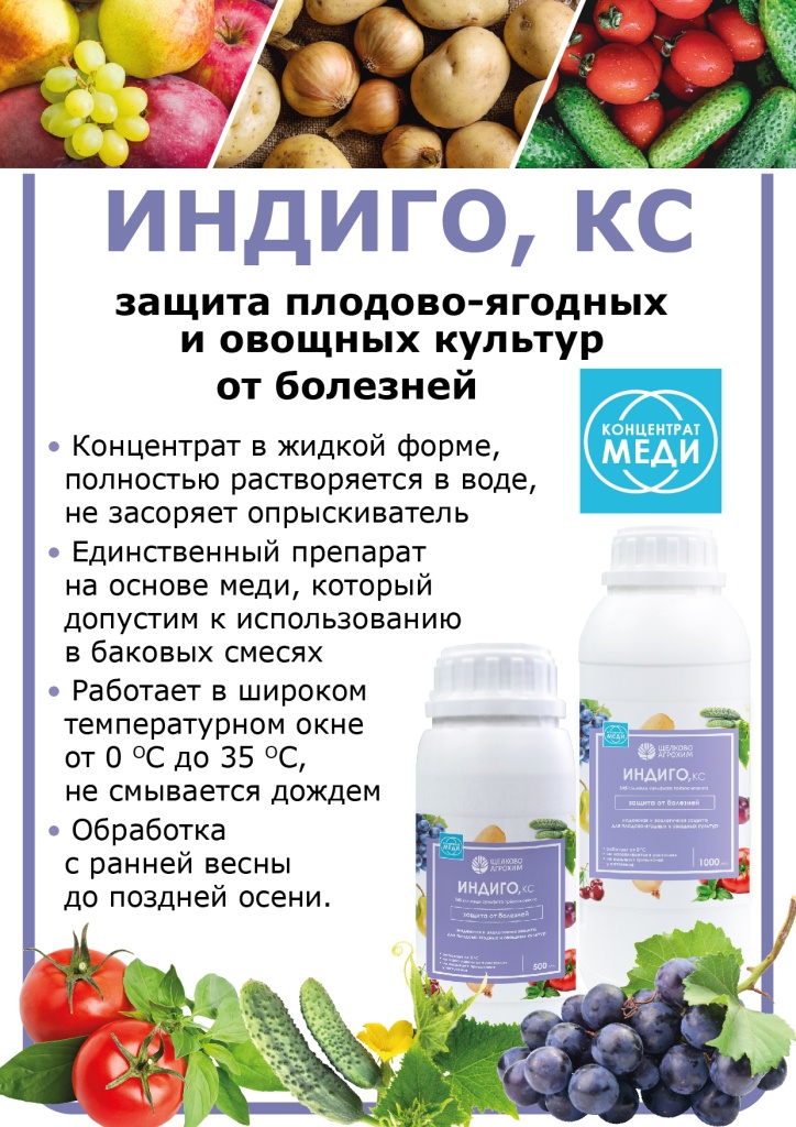 «Индиго, КС» – медьсодержащий препарат нового поколения, предназначенный для борьбы с комплексом болезней на всех культурах. Ионы меди попадают в клетки фитопатогенных спор и начинают взаимодействовать с ферментами. Как результат, споры прекращают расти и не могут нанести вред растению. «Индиго,КС» – концентрированный препарат в жидкой форме, который не выпадает в осадок. Он безопасен для культур, совместим с другими препаратами. Действие «Индиго, КС» начинается сразу после обработки и продолжается в течение 14 дней в зависимости от погодных условий и инфекционной нагрузки. Максимальный фунгицидный эффект проявляется при профилактическом применении до появления симптомов болезни. Активен при температуре от 0 °C до +35 °C, не смывается дождём.