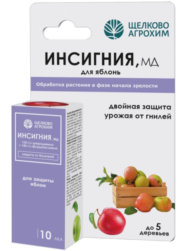 Фунгицид «Инсигния, МД» разработан специально для борьбы с болезнями хранения плодов. Плоды обрабатываются двукратно в фазу начала спелости плодов и за неделю до съема урожая. За счет сочетания двух компонентов с различными механизмами действия фунгицид действует на всех этапах развития патогена, обеспечивая надежную защиту от проникновения и развития болезней.