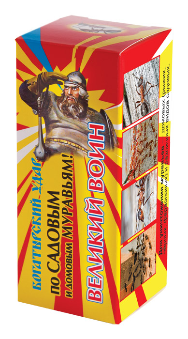 Как известно, повышенный интерес муравьи проявляют к жидким сладким продуктам (компот, сироп и т.п.). Именно поэтому новая разработка «Великий воин инсектицидный сироп» так эффективна в борьбе с ними. К тому же, действующим веществом в ней является бура — гибельная для муравьев, но малоопасная для человека. «Великий воин инсектицидный сироп» поможет избавится не только от садовых рыжих и черных муравьев, но и от домовых, и даже от фараоновых муравьев!