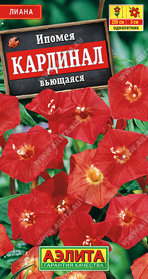 Изящная быстрорастущая однолетняя лиана. Растение способно активно взбираться вверх по любой опоре на высоту более 250 см. Кружевная листва очень декоративна, а в период цветения покрывается ярко-красными мелкими цветками, что делает растение очень эффектным и потрясающе красивым. Ипомея Кардинал вьющаяся используется для вертикального озеленения в саду и на балконах. "Семена"