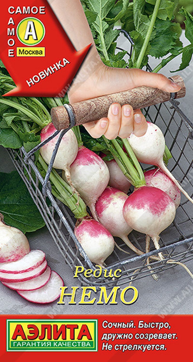 Скороспелый сорт. Устойчивый к стрелкованию растений и дряблению корнеплодов. Подходит для получения пучковой продукции. Розетка листьев прямостоячая, компактная. Корнеплоды двухцветные, округлые, ровные, массой 22-25 г. При сборе урожая через 28-30 дней после появления всходов белый цвет преобладает в их окраске, а спустя 35-40 дней – красный цвет окрашивает уже половину корнеплода. Мякоть белая, сочная, слабоострого вкуса, без пустот и грубых волокон. Этот сорт – полезный и аппетитный ингредиент для салатов, закусок и окрошки. "Семена"