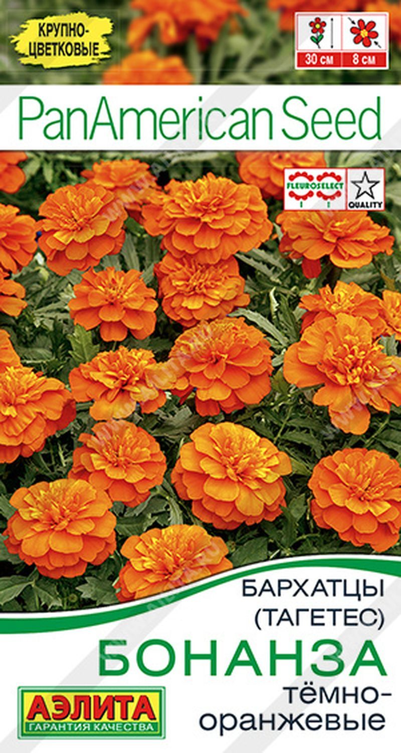 Яркий, солнечный представитель серии Bonanza американской селекции, удостоенный награды международной организации производителей цветочных семян FLEUROSELECT. Сорт удивительно крупноцветковый для отклоненных (французских) бархатцев, цветки ? 5-8 см! Растения низкорослые, высотой 25-30 см. Кустики плотные, густые, компактные, зацветают рано. Отлично адаптируются к различным условиям выращивания. При этом сохраняют потрясающую «сочность» апельсинового оттенка и по-настоящему роскошное, пышное цветение. Это идеальное украшение садовых клумб в качестве ковровых посадок, а также находка для балконных контейнеров и горшков. "Семена"