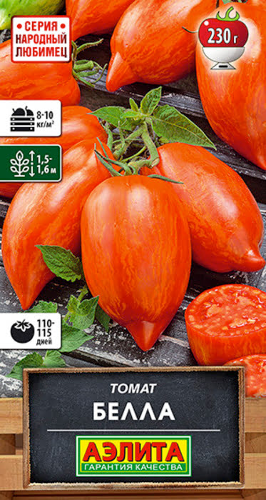 Томат Белла - это сорт томата, который полюбился всем за необычную форму плодов и сладкий вкус. Среднеспелый – от всходов до сбора первых плодов 110-115 дней. Индетерминантный, высотой в теплице 1,5-1,6 м. Плоды* вытянутой формы с характерным носиком, массой 120-230 г, собраны в кисти по 4-6 шт. Томаты ярко-красного цвета с золотистыми полосками. Очень плотные и мясистые. Великолепно выглядят в заготовках. Урожайность в теплице – 8-10 кг/м2.