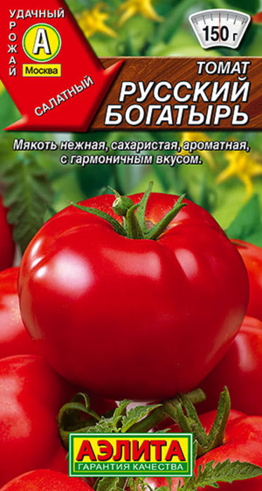 Томат Русский богатырь - это высокоурожайный среднеспелый сорт. В средней полосе рекомендуется для пленочных укрытий, в южных регионах - для открытого грунта. От полных всходов до начала созревания плодов 98-114 дней. Растения детерминантные, высотой 60-80 см.