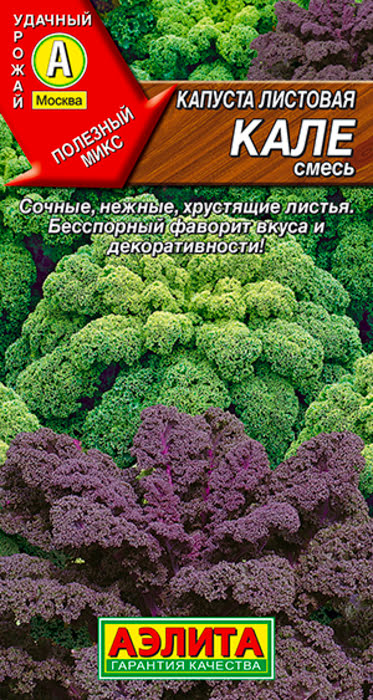 Капуста листовая Кале, смесь - это сорт аппетитной, сочной и нежной листовой капусты – кладезь витаминов и антиоксидантов! Неповторимая по вкусовым качествам, она обладает и бесспорной декоративностью. Даже в сольной культуре эта смесь – роскошное украшение сада и огорода. Высота растений 45-55 см. Сорта холодостойкие, выдерживают летний зной, сохраняя эталонный вкус. Широко используются в домашней кулинарии в качестве гарнира, ингредиента для салатов, при замораживании овощных смесей.