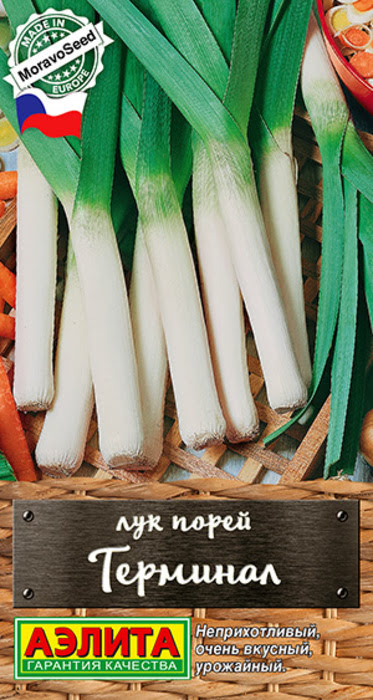 Лук порей Терминал - это урожайный, среднеспелый сорт чешской селекции от компании MoravoSeed. Период от появления всходов до уборки 150-170 дней. Растения мощные, прямостоячие, с матовыми, темно-зелеными листьями. Длина отбеленной части 35-40 см, масса 150-180 г. Вкус продукции в меру острый, гармоничный. Сорт хорошо хранится. Используется в свежем виде и в домашней кулинарии. Урожайность продуктивной части – 3-3,5 кг/м2.