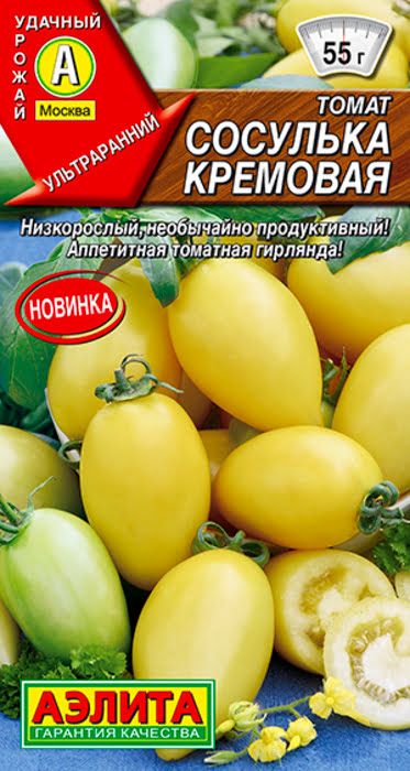 Томат Сосулька кремовая - это суперурожайный, детерминантный сорт. Раннеспелый: первые плоды можно попробовать через 100-110 дней после появления всходов. В каждой кисти образуется 5-10 завязей. Томаты* овальные, с небольшими носиками, плотные, массой 45-55 г. Мякоть кремового цвета, очень сладкая, нежная и ароматная. При выращивании в теплице урожайность сорта достигает 8-11 кг/м2. *Форма плодов может меняться в зависимости от условий.