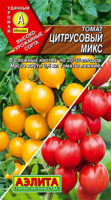 Томат Цитрусовый микс, смесь - это сорт высокоурожайных томатов с красивыми плодами характерной формы с «носиком». Включает сорта Сеньор Помидор ® и Цитрусовый сад ® . Оба сорта среднеспелые, вступают в плодоношение на 111-115 день от всходов. Растения индетерминантные, высокие – 2 м. В сложных кистях по 20-30 плодов массой 55-80 г. Общая масса кисти до 2,5 кг. Томаты лежкие, хорошо дозариваются. Использование универсальное.