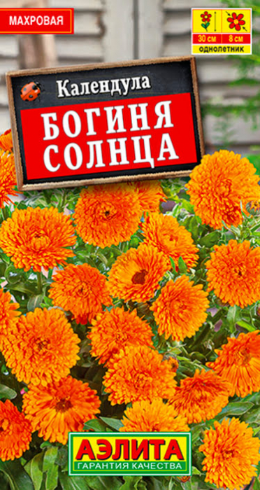 Календула Богиня солнца - это сорт с крупными махровыми соцветиями-корзинками (Ø7-9 см). Кустики коренастые, сильноветвистые, высотой до 30 см. Цветение раннее, обильное и продолжительное. Растения неприхотливые, хорошо переносят кратковременные заморозки до -5°С, устойчивы к болезням и вредителям. Предпочитают солнечное местоположение. Используют для групповых посадок на клумбах и рабатках, в лекарственных садиках. Хорошо подходят для срезки.