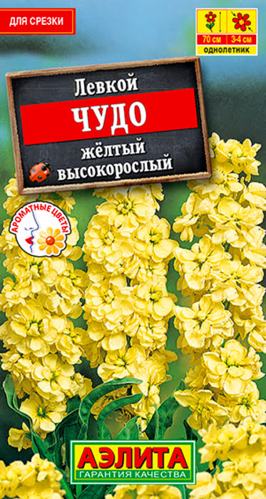 Левкой высокорослый Чудо желтый - это это сорт - ценнейший летник для срезки, сохраняющий свежесть соцветий до 10 дней. Высокорослый, слабоветвящийся одностебельный сорт из садовой группы эксцельсиор – прелесть сада и букета. Растения шикарно выглядят группами в солнечных уголках сада и отлично подходят для украшения заднего плана сборных цветников. Выберите для него солнечное место с не тяжелой, нейтральной по кислотности почвой, регулярно поливайте (без переувлажнения) и периодически подкармливайте комплексным минеральным удобрением.