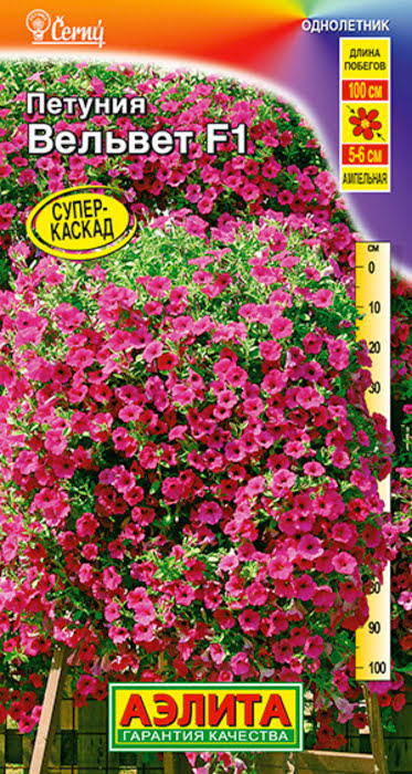 Петуния Вельвет F1 ампельная - это знаменитый сорт - гибрид, пользующийся признанием в Европе. Ампельная петуния типа сурфиний с непревзойденными характеристиками декоративности. По обилию цветения конкурирует с сортами, размножаемыми вегетативно. Длина хорошо ветвящихся побегов достигает 1 м. Гибрид можно использовать не только в ампельной культуре, но и в ковровых посадках в открытом грунте, где одно растение способно занять 1,5 м 2 площади, генерируя огромную массу цветков Ø 5-6 см вплоть до заморозков. Востребованный гибрид, всегда в тренде!