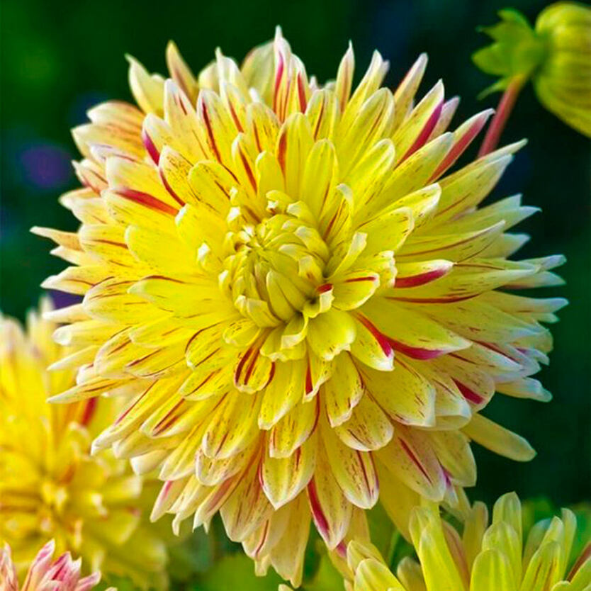 Это растение корнями-клубнями из семейства сложноцветных напоминает яркой жёлто-алой окраской о своей родине, солнечной Мексике. Высотой эта декоративная георгина бывает до метра, диаметр цветков 20 см. Растение обильно ветвится, образуя куст, на нём вырастает множество соцветий. Корзинки у них полумахровые. Листья крупные, перистые. Любят сухие, солнечные участки и жирные садовые суглинки. На затенённых, чрезмерно влажных местах растения гибнут.