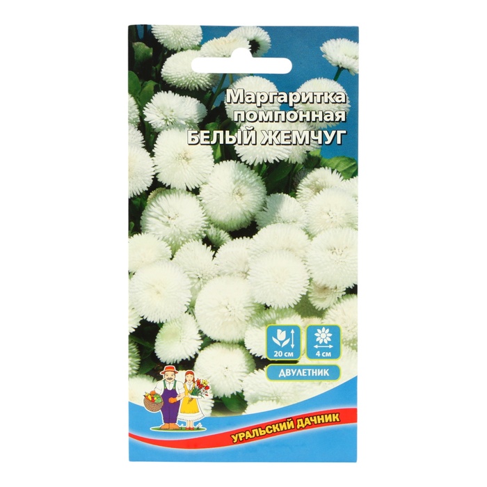 Прекрасные жемчужины вашего сада! Неприхотливое, очень зимостойкое растение. Махровые помпонные соцветия, 4-5 см в диаметре, белоснежной окраски. Маргаритка прекрасно подходит для выращивания на клумбах, рабатках и в бордюрах, а также в горшках и балконных ящиках.