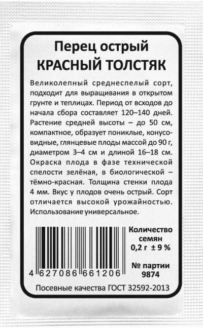 Великолепный среднеспелый сорт, подходит для выращивания в открытом грунте и теплицах. Период от всходов до начала сбора составляет 120-140 дней. Растение средней высоты – до 50 см, компактное, образует пониклые, конусовидные, глянцевые плоды массой до 90 г, диаметром 3-4 см и длиной 16-18 см. Окраска плода в фазе технической спелости зелёная, в биологической – тёмно-красная. Толщина стенки плода 4 мм.