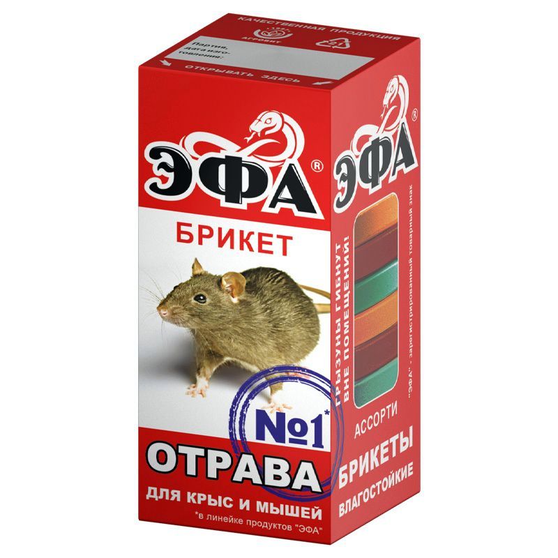 Средство родентицидное Эфа-брикет представляет собой готовую пищевую приманку в виде таблетированных брикетов с влагостойкими свойствами различных цветов с натуральными пищевыми аттрактантами для привлечения грызунов. Обладают высокой родентицидной активностью в отношении серых крыс, домовых мышей, полевок и других грызунов. Натуральное пищевое сырье и ароматизаторы обеспечивают высокую поедаемость приманки грызунами с различными вкусовыми предпочтениями. В упаковке 3 вида таблеток-брикетов: бирюзового цвета (со вкусом зерна); цвета охра (со вкусом лесного ореха); коричневого цвета (с ароматом шоколада).