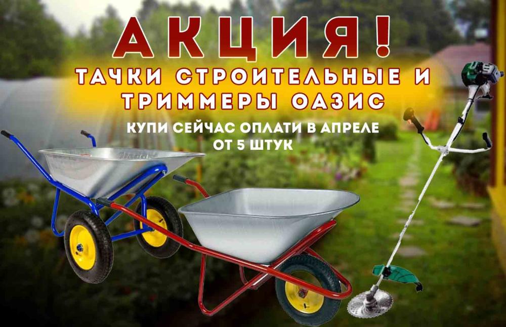 При покупке от 5 единиц садово - строительных тачек и триммеров "Oasis" за наличный или безналичный расчёт действует рассрочка платежа до конца апреля 2026 года*