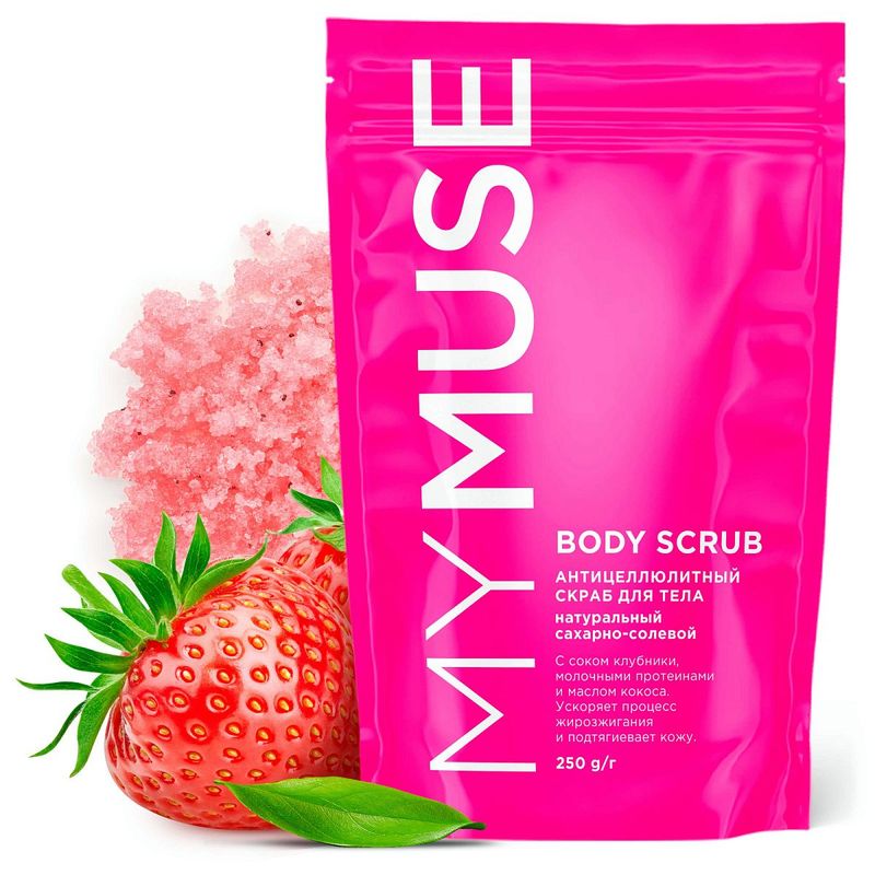 Натуральный антицеллютиный скраб для тела с соком клубники, молочными протеинами и маслом кокоса.