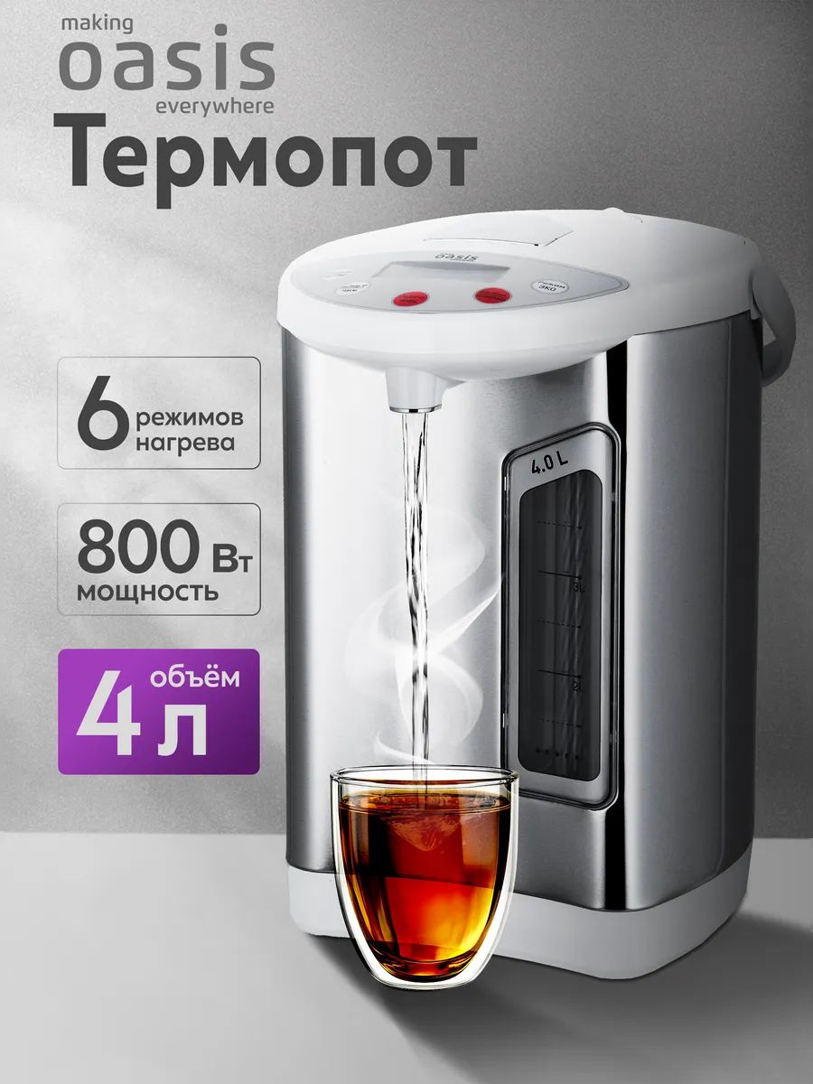 Термопот TP-4LDS от making OASIS everywhere – это идеальное решение для тех, кто ценит комфорт и удобство. Этот стильный и функциональный прибор станет незаменимым помощником на кухне, в офисе или на даче. Объем термопота составляет 4 литра, что позволяет приготовить достаточное количество горячей воды для всей семьи или коллектива. Термопот оснащен шестью температурными режимами, что позволяет выбрать оптимальную температуру для различных напитков, от чая и кофе до какао и детского питания. Корпус термопота выполнен из прочного и долговечного материала – комбинации металла, пластика и стали, что гарантирует его надежность и устойчивость к повреждениям. Управление термопотом осуществляется как электронным, так и механическим способом, что делает его использование максимально удобным.