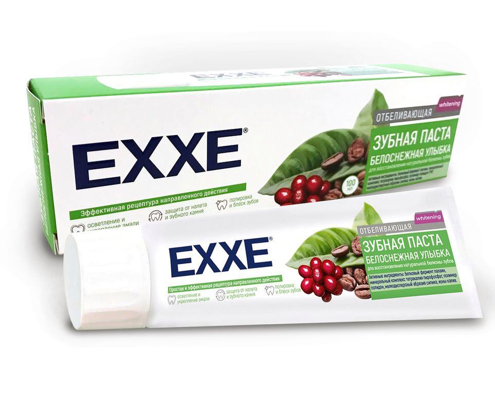 Отбеливающая зубная паста EXXE® «Белоснежная улыбка»  идеально подходит для ежедневной гигиены полости рта и восстановления естественной белизны зубов. Простая и эффективная рецептура направленного действия – осветление эмали, бережное воздействие на зубную эмаль, расщепление зубного налета.