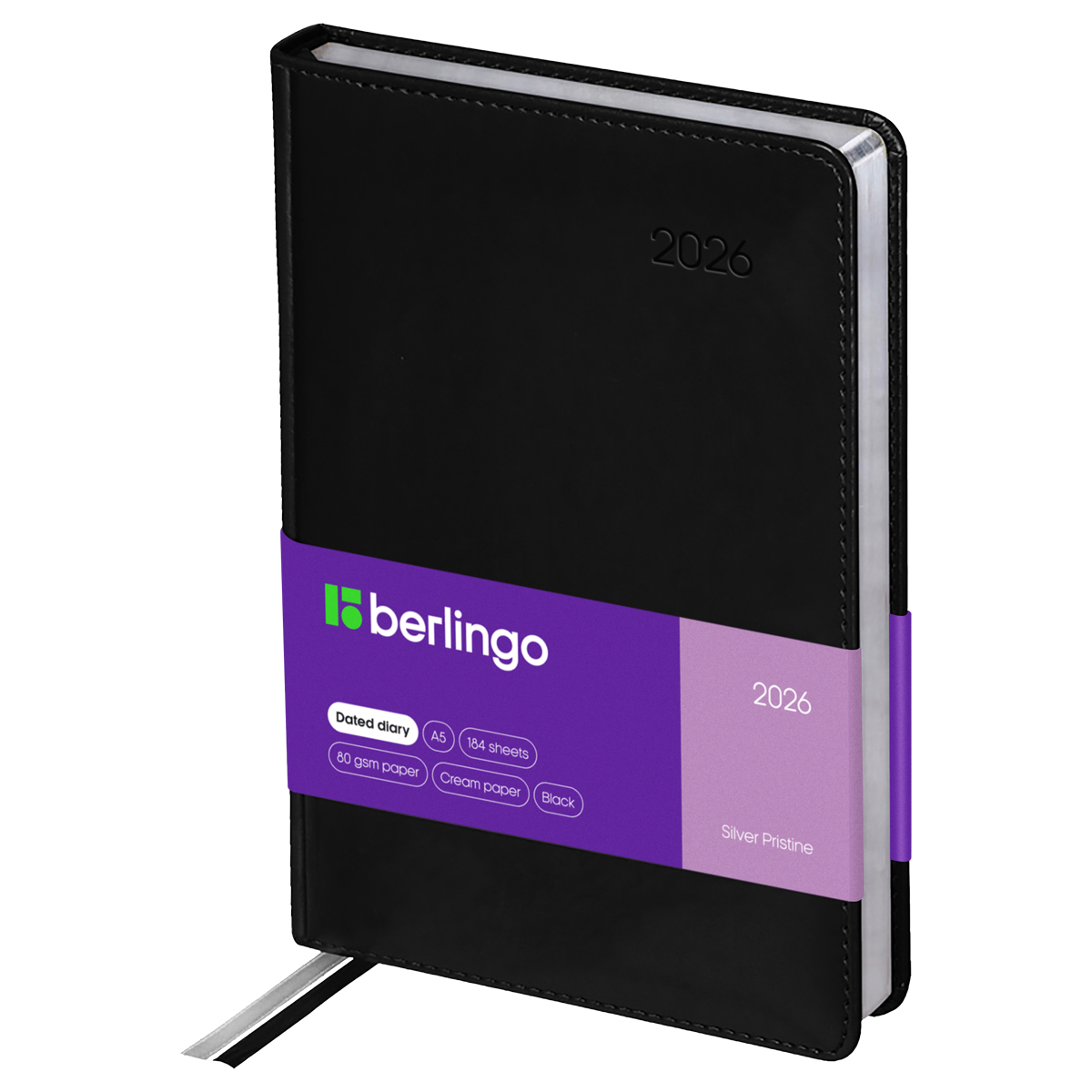 Датированный ежедневник на 2026 год Berlingo Silver Pristine формата B5 (175*250 мм) станет стильным помощником в планировании. Чёрная обложка с поролоновой прослойкой и прострочкой по периметру изготовлена из глянцевой экокожи, имитирующей лакированную кожу первоклассной выделки. Её дизайн дополняет серебряный фольгированный срез внутреннего блока из 184 листов высококачественной кремовой бумаги повышенной плотности 80 г/м2 с пантонной печатью в 2 краски. На обложке есть печать года. Перфорированные уголки блока, отрывные заметки и 2 закладки-ляссе обеспечивают комфорт при использовании ежедневника. Внутри изделия есть полезный справочный материал и бланки-извещения о ДТП. В подарок 3 комплекта креативных брендированных стикеров.