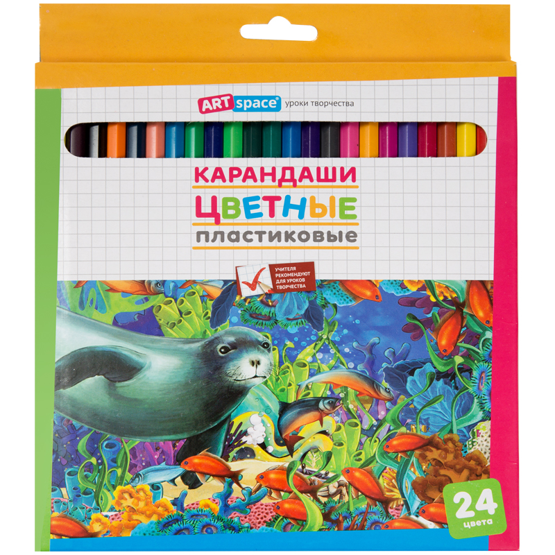 Набор цветных карандашей, ARTSpace "Подводный мир", 24 цветов, картонная коробка с европодвесом. Материал - пластик. Карандаши легко затачиваются, имеют гибкий пластиковый шестигранный корпус, яркие естественные цвета и прочный грифель. Карандаш гнется, на сломе нет острых краев.