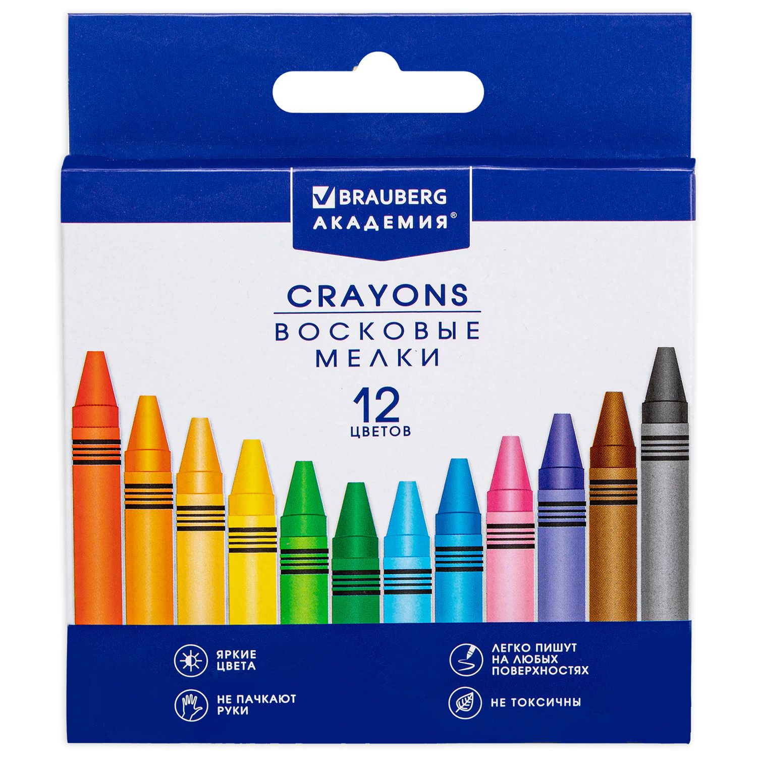 Палитра состоит из 12 ярких и насыщенных цветов. Полностью безопасны в использовании, не токсичны и не имеют резкого запаха. Благодаря своему составу мелки пишут мягко, и ребенку не придется прикладывать усилия в процессе рисования. Круглая форма корпуса и диаметр 8 мм делают их удобными для тренировки руки к письму у дошкольников и детей младшего школьного возраста, формируют навык правильного захвата, снижают нагрузку на кисти рук. Каждый мелок завернут в бумажную этикетку, что предохраняет от загрязнений, снижает скольжение, увеличивает прочность. Восковые мелки упакованы в картонную коробку с европодвесом.