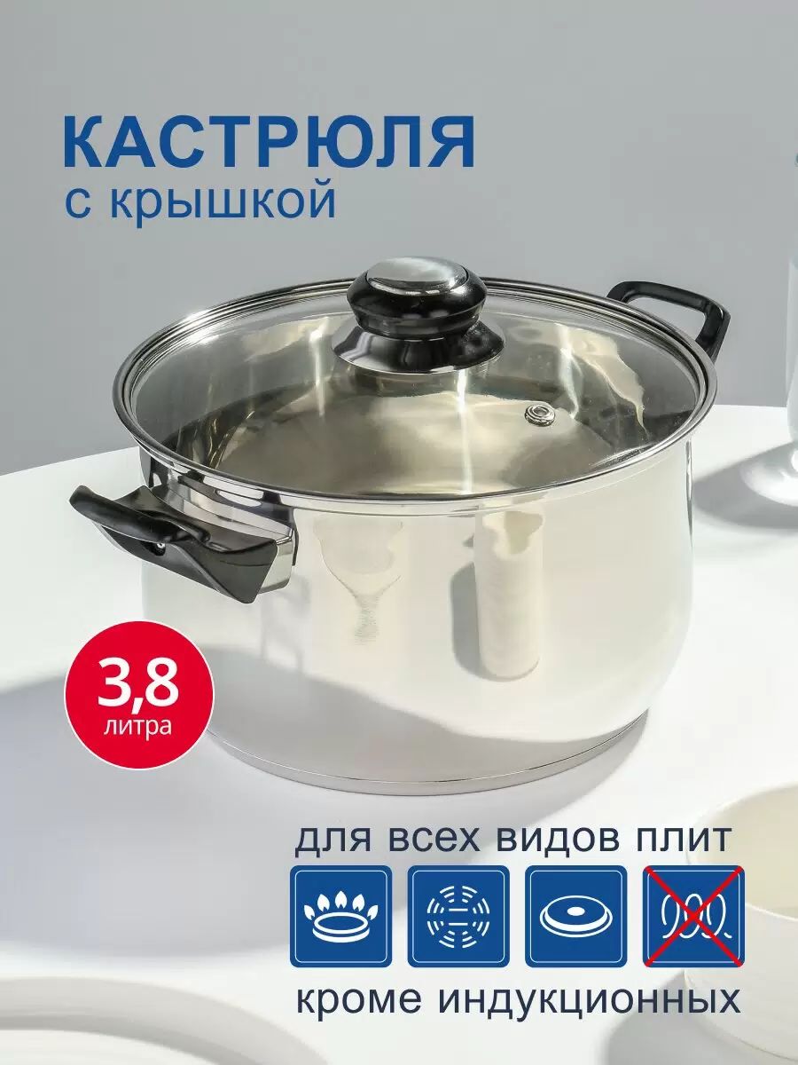 Кастрюля из нержавеющей стали 3.8 л с мерной шкалой и стеклянной крышкой — оптимальный выбор для семьи: удобно готовить суп, макароны, кашу дома и на даче.
