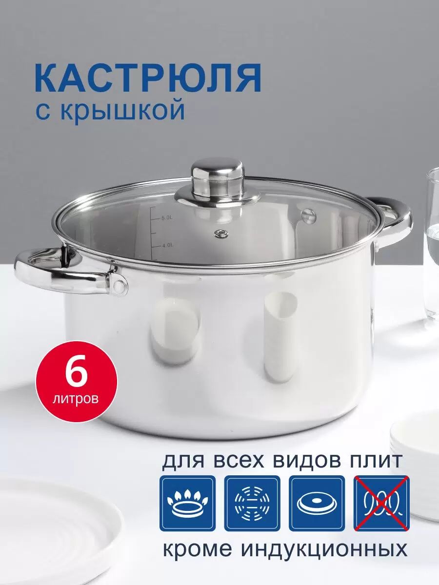 Кастрюля из нержавеющей стали 6 л с мерной шкалой и стеклянной крышкой — оптимальный выбор для семьи и дачи: долговечность, универсальность, легкий уход.