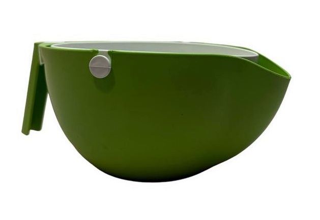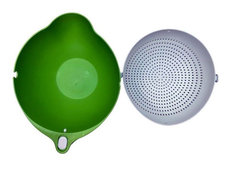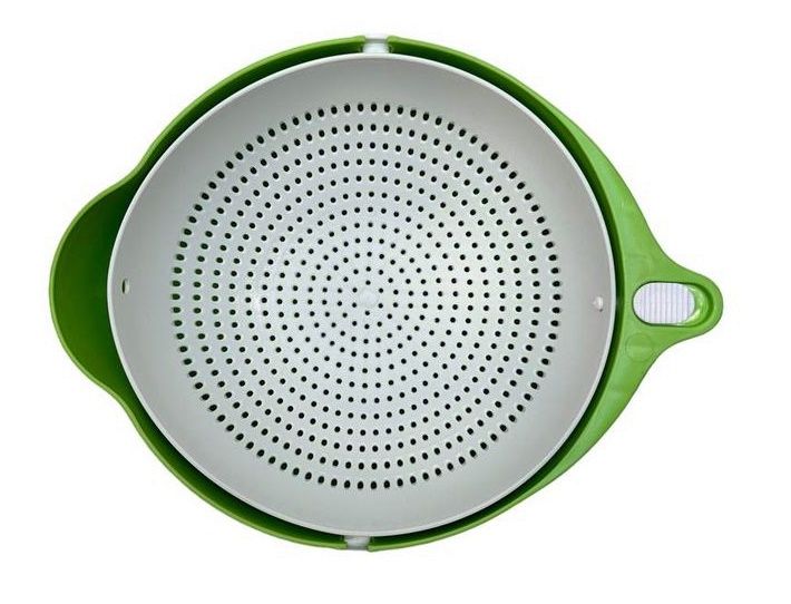 Миска дуршлаг 2 в 1. Комплект состоит из миски и дуршлага, Комплект из миски и дуршлага с поворотным механизмом, который при мытье продуктов в нем принимает горизонтальное положение, давая воде стекать и не просыпаться в раковину. Есть фиксирующий клапан замок, для фиксации и промывки овощей, фруктов, макарон и спагетти. Дуршлаг подходит для мытья в посудомоечной машине.