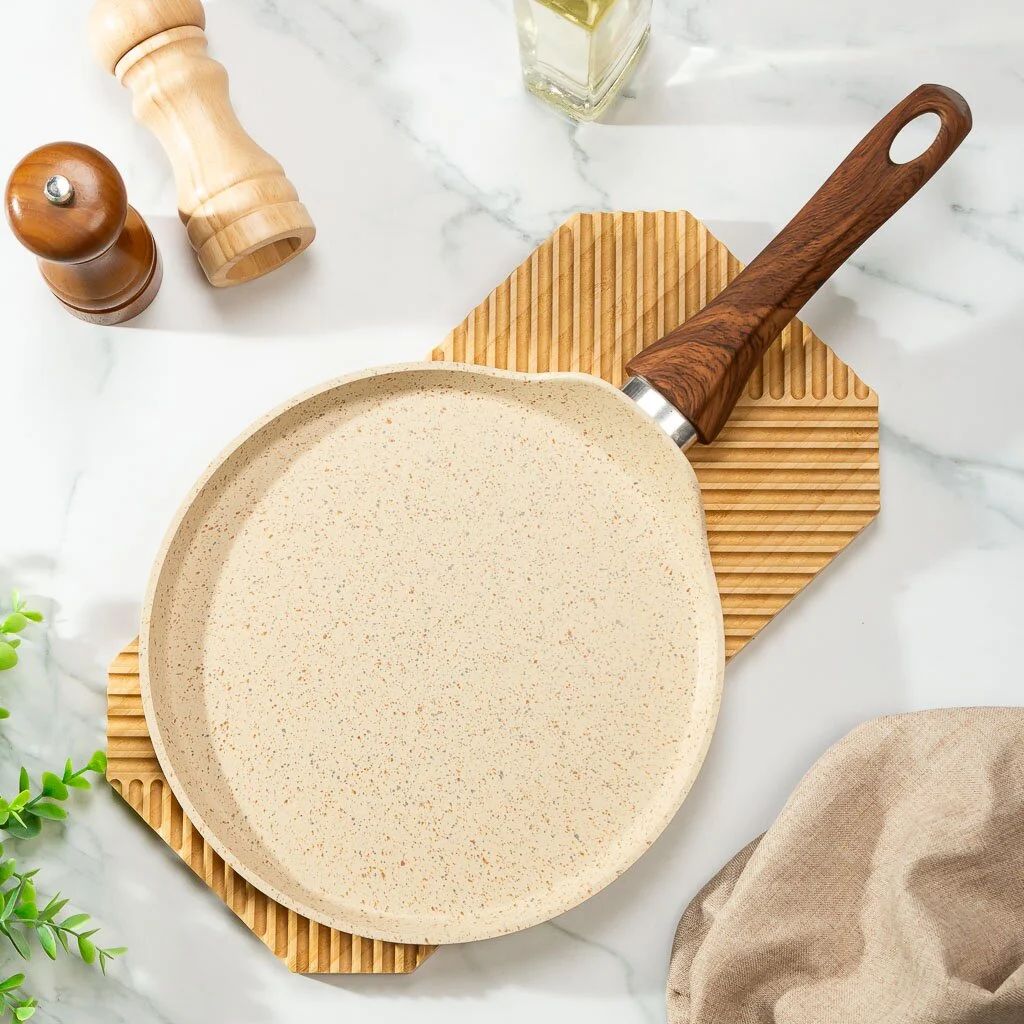 Эта блинница имеет антипригарное гранитное покрытие, благодаря которому блины не прилипают и легко переворачиваются. Диаметр 24 см позволяет готовить блины идеального размера для всей семьи. Блинница подходит для всех типов плит, включая газовые, электрические, индукционные и стеклокерамические, что делает ее универсальным инструментом на любой кухне.
