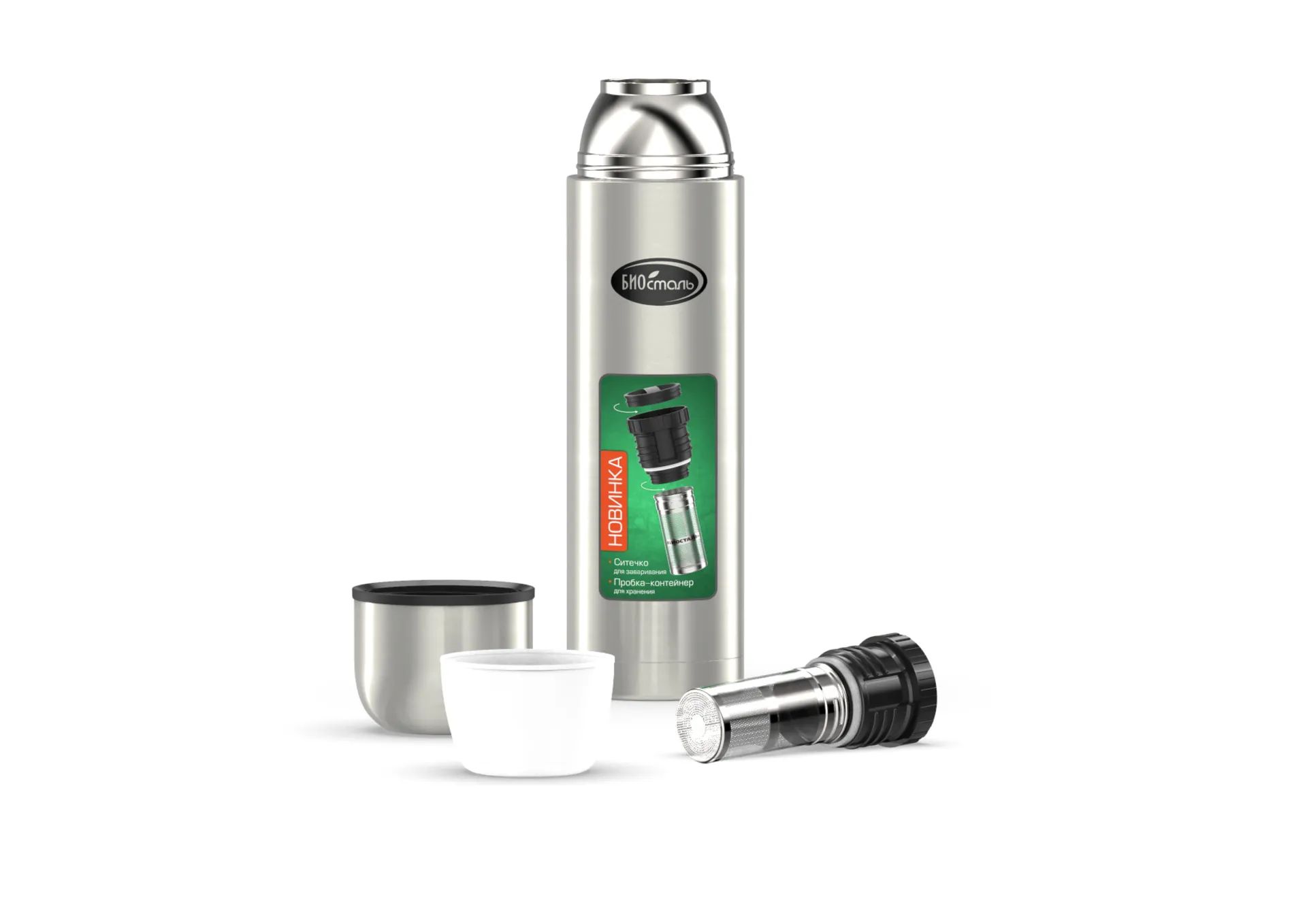Термос с ситечком из нержавеющей стали 18/8 и пробкой-контейнером. Дополнительная чашка из прочного пищевого пластика.