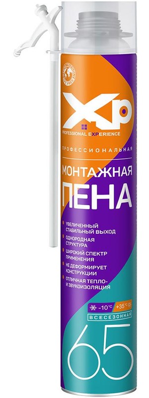 Пена профессиональная универсальная 65л XP всесезонная 900гр 01-01-38; 11614200 Пена монтажная профессиональная всесезонная Хр 65 – однокомпонентная полиуретановая пена, предназначенная для монтажа оконных рам и дверных коробок, герметизации швов, щелей, пустот, утепления строительных конструкций, фиксации тепло- и звукоизоляционных материалов. ПРЕИМУЩЕСТВА: - Высокая адгезия к большинству строительных материалов - Однородная равномерная структура - Стойкость к плесени и грибку - Отсутствие деформации в конструкции - Экологически безопасна после отверждения