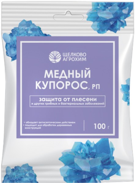 Античесптическое фунгицидное средство «Медный купорос» применяется в борьбе с плесенью и другими грибными и бактериальными заболеваниями плодово-ягодных культур. Средство также используется для дезинфекции почвы, чтобы искоренить гнили, фузариоз и черную ножку. Вдобавок препарат подходит при борьбе и профилактике бактериального рака. «Медный купорос» используют для обработки деревянных конструкций, погребов, подполий, бань, настилов, заборов и т. д.
