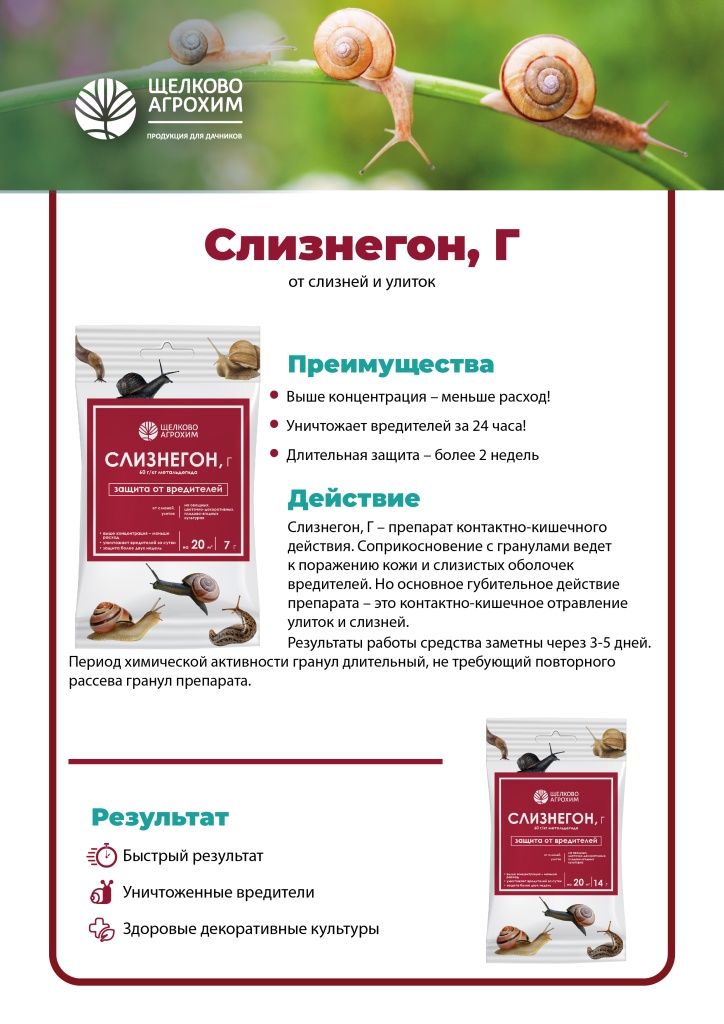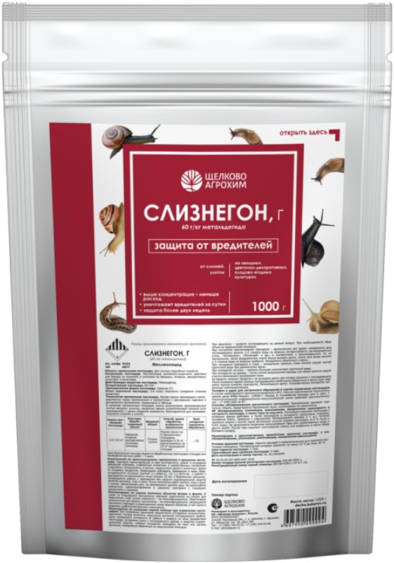 «Слизнегон, Г» с удвоенной концентрацией метальдегида предназначен для борьбы со слизнями и улитками на овощах, ягодах, декоративных культурах и винограде. Препарат выпускается в виде гранул, которые нужно равномерно рассыпать в местах частого скопления улиток, между грядками, вокруг растений или заложить в ловушки. Действие препарата начинается через несколько минут после контакта с вредителями, и в течение нескольких часов они погибают. Метальдегид попадает в организм вредителей двумя путями: через кожные покровы после соприкосновения с гранулами и с пищей. «Слизнегон, Г» повреждает слизистые клетки в пищеварительном тракте, после чего моллюски теряют жидкость, высыхают и умирают.