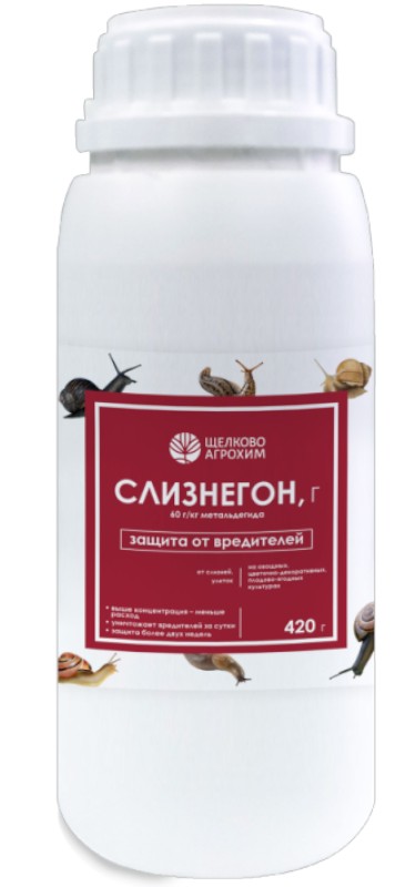 «Слизнегон, Г» с удвоенной концентрацией метальдегида предназначен для борьбы со слизнями и улитками на овощах, ягодах, декоративных культурах и винограде. Препарат выпускается в виде гранул, которые нужно равномерно рассыпать в местах частого скопления улиток, между грядками, вокруг растений или заложить в ловушки. Действие препарата начинается через несколько минут после контакта с вредителями, и в течение нескольких часов они погибают. Метальдегид попадает в организм вредителей двумя путями: через кожные покровы после соприкосновения с гранулами и с пищей. «Слизнегон, Г» повреждает слизистые клетки в пищеварительном тракте, после чего моллюски теряют жидкость, высыхают и умирают.