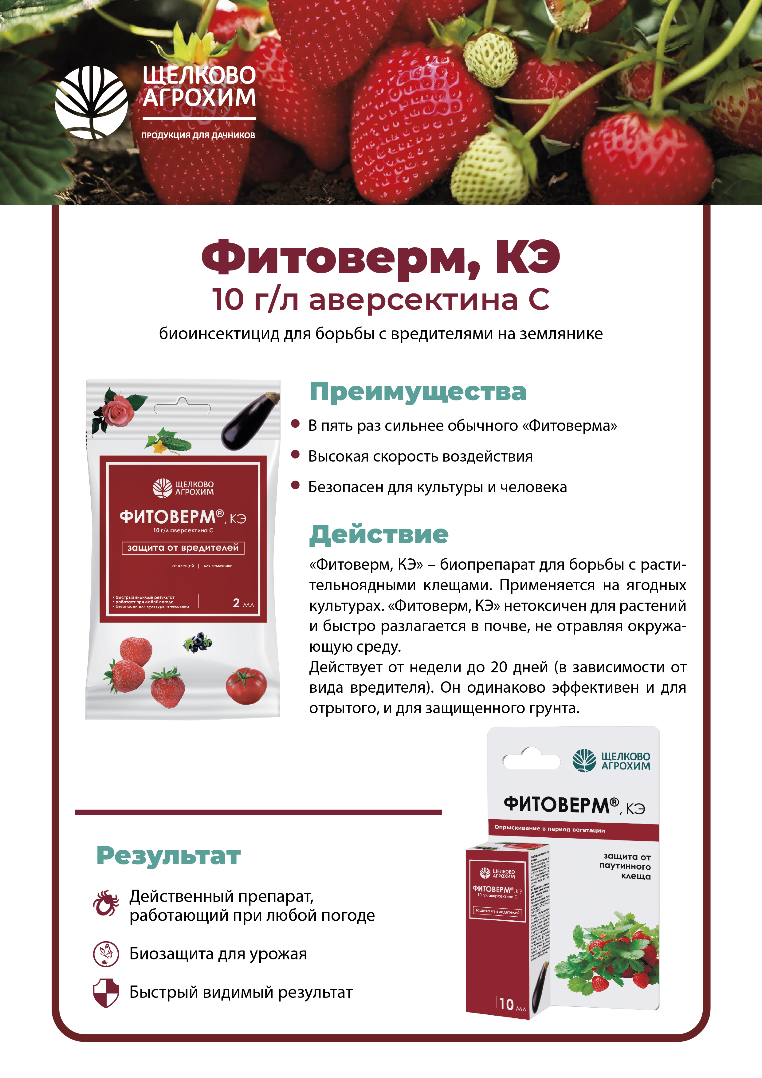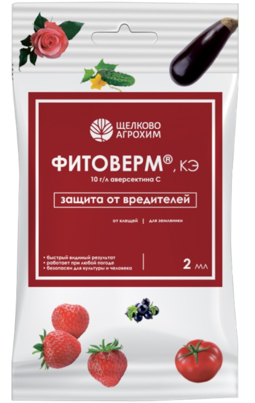 «Фитоверм» – биопрепарат для борьбы с комплексом вредителей: клещами, тлями, трипсами, гусеницами. Эффективен в борьбе с более чем 20 видами вредителей. «Фитоверм» нетоксичен для растений и быстро разлагается в почве, не отравляя окружающую среду. Действует от недели до 20 дней (в зависимости от вида вредителя). Он одинаково эффективен и для открытого, и для защищенного грунта.