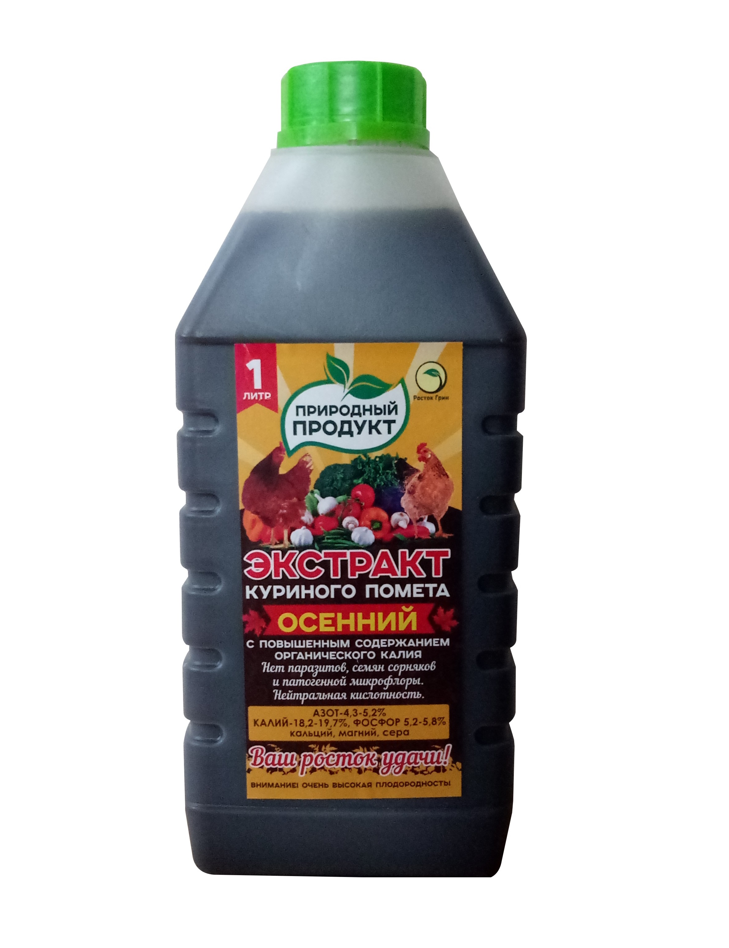 Экстракт куриного помета осенний - это жидкое, 100% безопасное, органическое удобрение с повышенным содержание органического калия и микроэлементов. Используется в качестве подкормки в летне-осенний период, в том числе после окончания плодоношения плодово-ягодных и декоративных деревьев и кустарников. Способствует ускорению созревания плодов и улучшения их вкусовых качеств, закладке плодовых почек на следующий год, подготавливает растения к зимнему периоду и стимулирует устойчивый иммунитет.