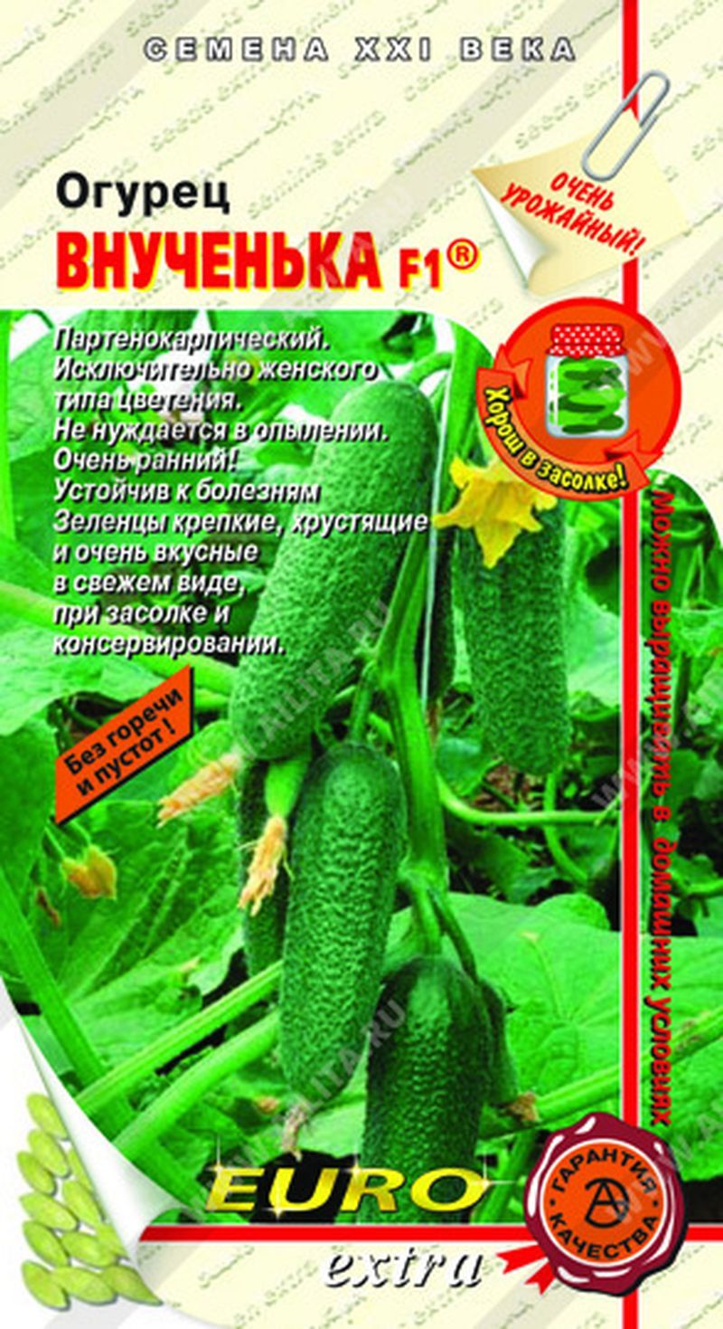 Новый очень ранний партенокарпический гибрид для открытого грунта, пленочных и стеклянных теплиц. Не нуждается в опылении. Исключительно женского типа цветения. Отличительные свойства: увеличенный период плодоношения, суперурожайность, высокая товарность плодов. Устойчив к вирусу огуречной мозаики, оливковой пятнистости, настоящей мучнистой росе, толерантен к ложной мучнистой росе. Растение среднеплетистое. Зеленец крепкий, хрустящий, мелкобугорчатый, овально-цилиндрический, масса 80-92 г, длина 7,9-9,8 см, соотношение длины к диаметру 3,2:1. Не содержит горечи. Прекрасные вкусовые качества при употреблении в свежем виде, а также при консервировании и засолке. ООО «АПФА» является эксклюзивным продавцом гибрида огурца «Внученька F1®» на рынке семян.