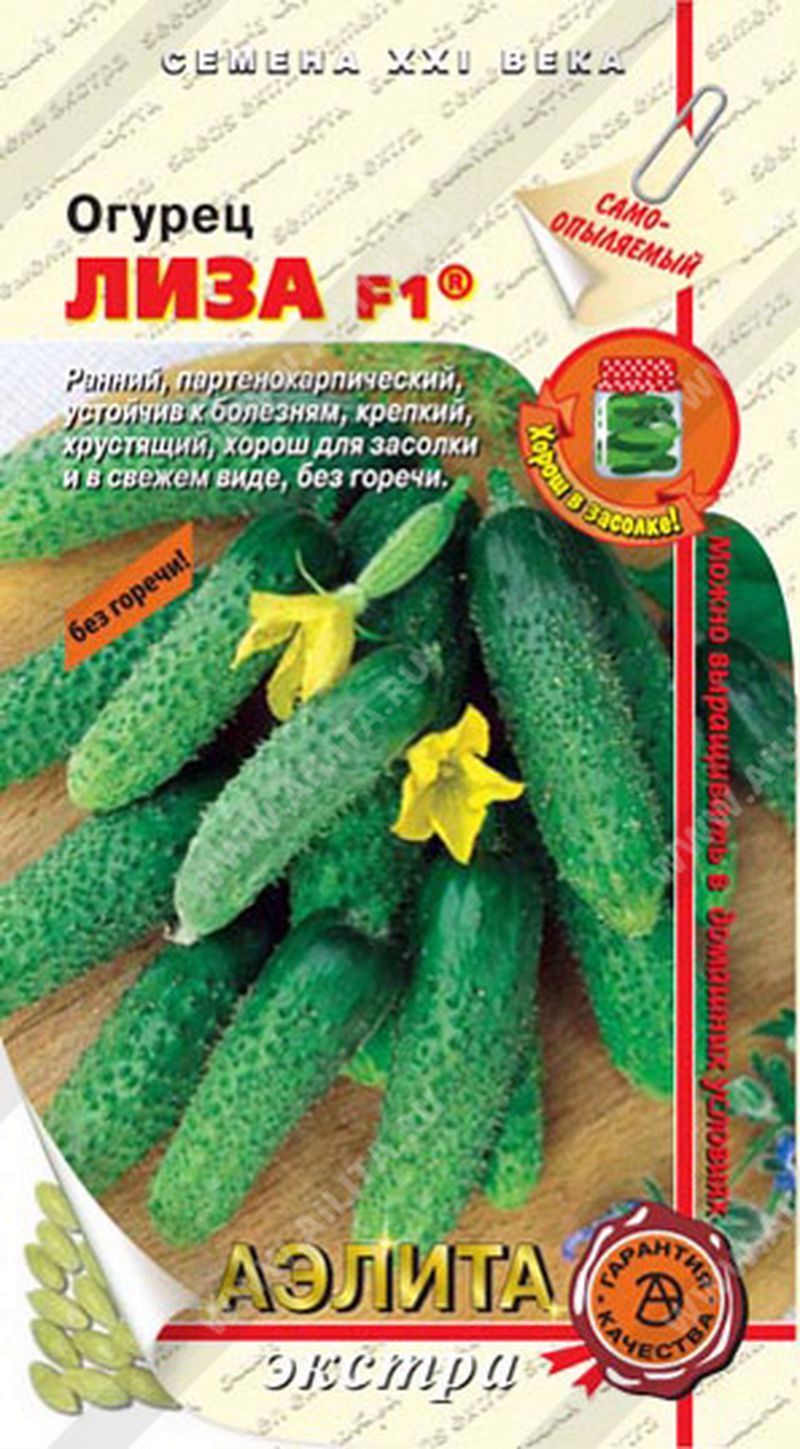Очень ранний партенокарпический гибрид универсального грунта, самоопыляемый. Гибрид отличается повышенной урожайностью и долгим периодом плодоношения. Устойчив к вирусу огуречной мозаики, оливковой пятнистости, настоящей мучнистой росе, толерантен к ложной мучнистой росе. Растения среднеплетистые. Зеленец ярко-зеленый, крепкий, хрустящий, крупнобугорчатый, овально-цилиндрический, масса 80-100 г, длина 7-9 см, соотношение длины к диаметру 3,1:1. Не содержит горечи. Вкусовые качества свежих и консервированных плодов отличные. Компания АЭЛИТА является эксклюзивным продавцом гибрида огурца «Лиза F1»® на рынке семян. "Семена"