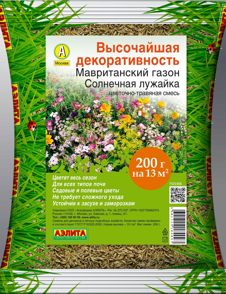 Смесь многолетних газонных злаковых трав (мятлик, овсяница, райграс, полевица) и неприхотливых садовых и полевых цветов. Состав цветущих растений: календула, хризантема, кореопсис, космея, эшшольция, гипсофила, подсолнечник, лаватера, лен, маттиола, цинния, флокс и другие. Пестрая лужайка полна естественного очарования и не требует сложного ухода. Подбор растений обеспечивает максимально длительный период цветения.
