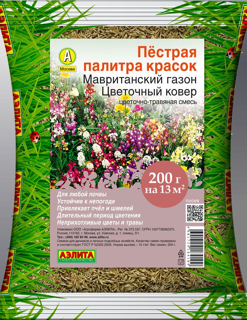 Пестрая смесь неприхотливых цветущих растений и многолетних злаковых трав для декоративного мавританского газона. Состав злаков: мятлик, овсяница, райграс, полевица. Состав цветущих растений: василёк, мальва, горчица, гречиха, хризантема, фацелия, укроп, подсолнечник декоративный, огуречная трава и другие. Подбор растений обеспечивает максимально длительный период цветения