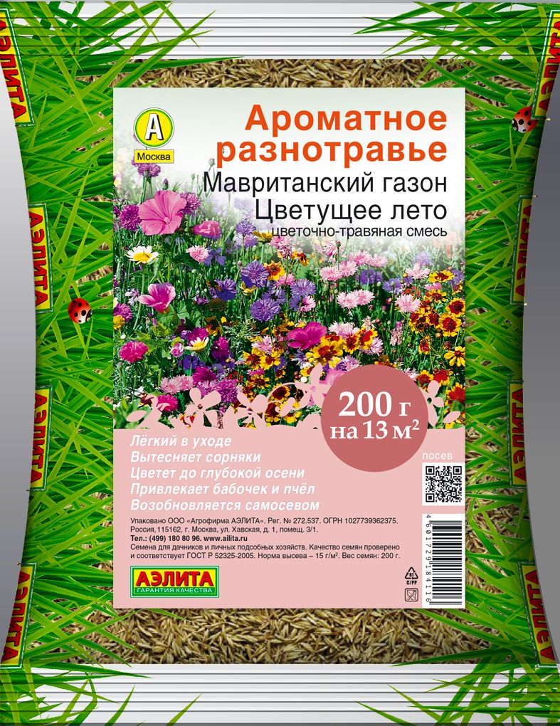 Специальная смесь для цветущего газона. Устойчивые многолетние злаки (мятлик, овсяница, райграс, полевица) служат фоном для пестрого микса неприхотливых ароматных цветов. Подбор растений обеспечивает максимально длительный период цветения. Наряду с привычными однолетниками в смеси присутствуют травы-медоносы: клевер и фацелия. Эти красивоцветущие растения улучшают структуру почвы и увеличивают ее плодородие.