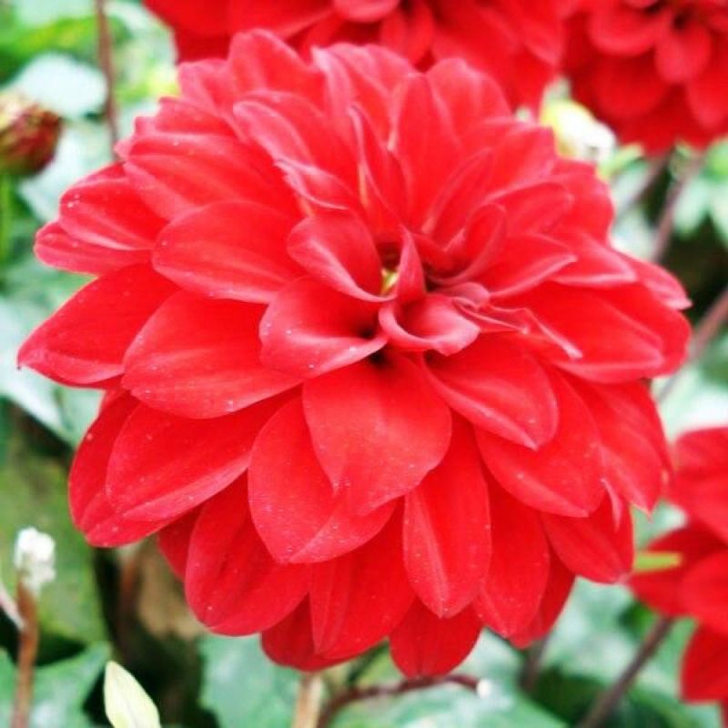 Роскошный представитель декоративных низкорослых георгин. Как ни крути, она изумляет со всех сторон. Ее плотные полумахровые цветки, состоят из множества темно-алых лепестков, заостренных на кончиках. Яркие соцветия невероятно эффектно смотрятся на компактных насыщенно-зеленых кустах. Сорт подходит для посадки в горшки и газоны.
