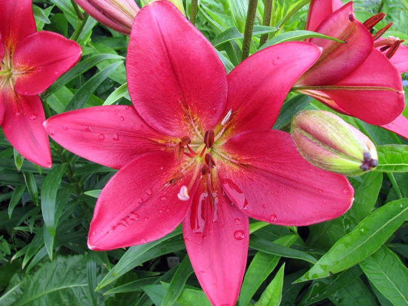 Лилия ЛА-гибрид "Кармин Диамонд" - полученная в результате скрещивания Лонгифлорум и Азиатских видов. Высота растения до 110 см. Цветки очень крупные, карминно-красного оттенка с редким крапом у основания, лепестки восковидной фактуры. Обильное цветение происходит в середине июля. Этот вид лилии не требует к себе особого ухода и прекрасно растёт в различных климатических условиях.
