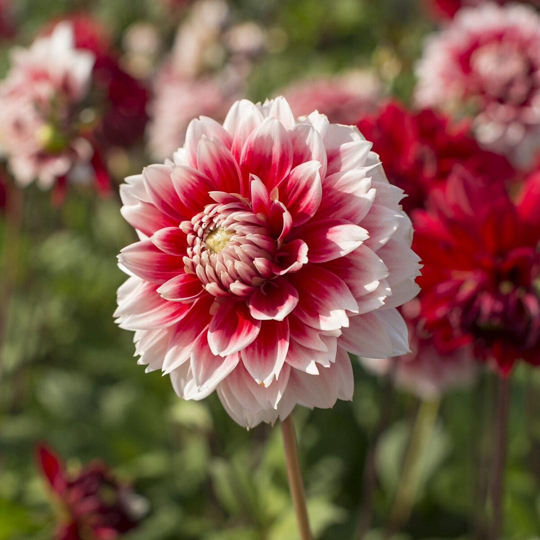 Георгина декоративная Рэд энд Уайт Фубуки выведен в 2000 году селекционерами Нидерландов. Яркое крупное соцветие с большим количеством лепестков диаметром 20-25 см. Для получения соцветий максимального размера нужно удалять боковые бутоны. Лепестки имеют клубнично-красную окраску с белыми зубчатыми краями. Георгина декоративная Рэд энд Уайт Фубуки относится к высокорослым сортам георгин. Максимальная высота стебля составляет 120 см. Роскошная георгина оживит даже самый мрачный сад в период с июля по сентябрь. Своей неприхотливостью Георгина декоративная Рэд энд Уайт Фубуки заслужила признание всех садоводов.