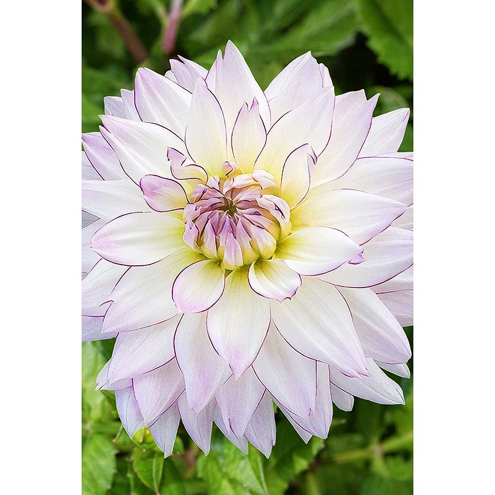 Махровые цветы имеют снежно-белую окраску, иногда со слабо-фиолетовым налетом и тонкой розово-фиолетовой каймой.
